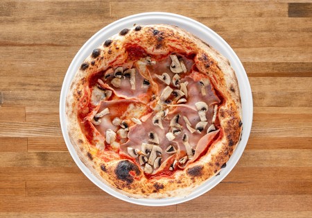 Pomidory San Marzano, mozzarella fior di latte, włoska szynka gotowana, pieczarki