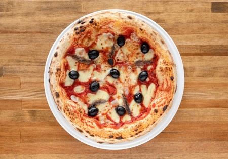 Pomidory San Marzano, mozzarella fior di latte, czosnek, anchois, czarne oliwki