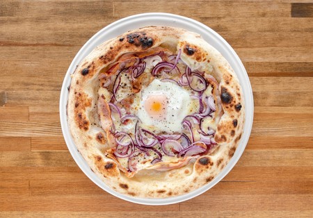 Mozzarella fior di latte, pancetta (włoski rolowany boczek), czerwona cebula, jajko, świeży pieprz