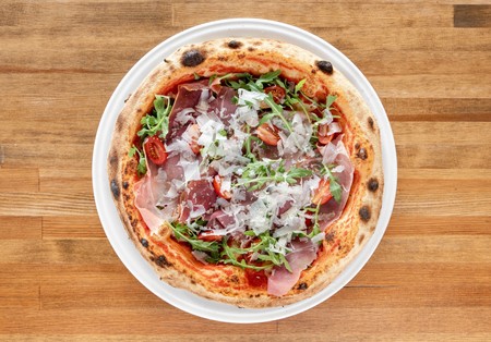 Pomidory San Marzano, mozzarella fior di latte, szynka parmeńska, rukola, pomidorki koktajlowe, Grana Padano D.O.P.