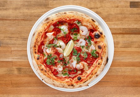 Pomidory San Marzano, mozzarella fior di latte, czosnek, krewetki , pikantne papryczki, kolendra, limonka